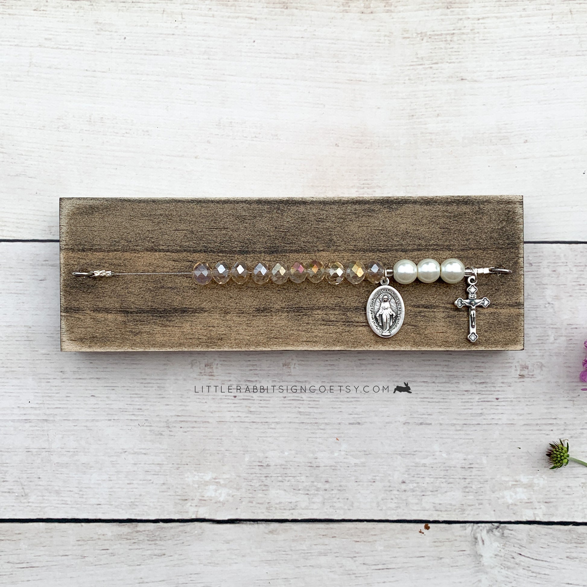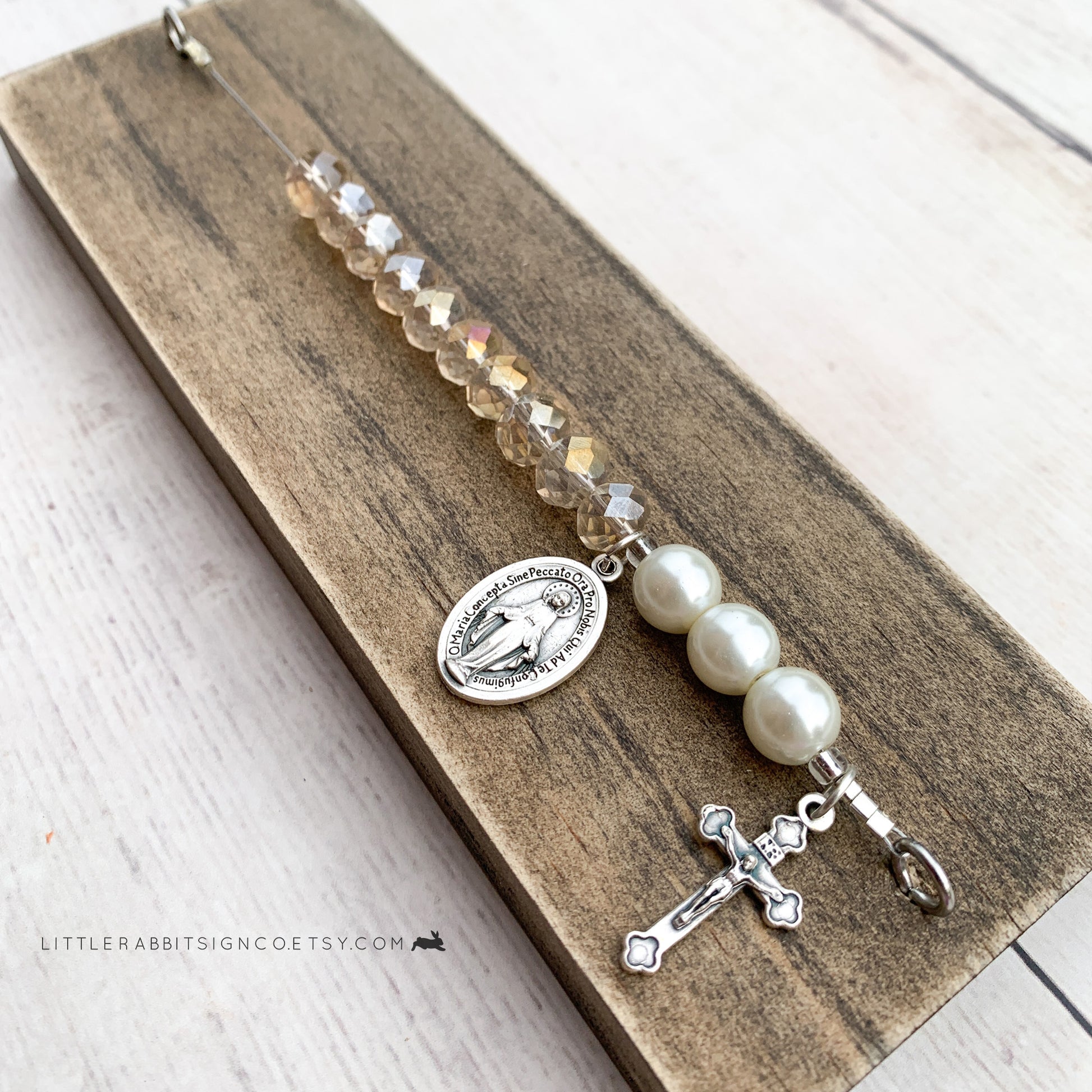 DELUXE DESK CHAPLET in gorgeous dark stained background with champagne crystals and ivory pearl beading. Also includes a miraculous medal and silver Byzantine Crucifix.
