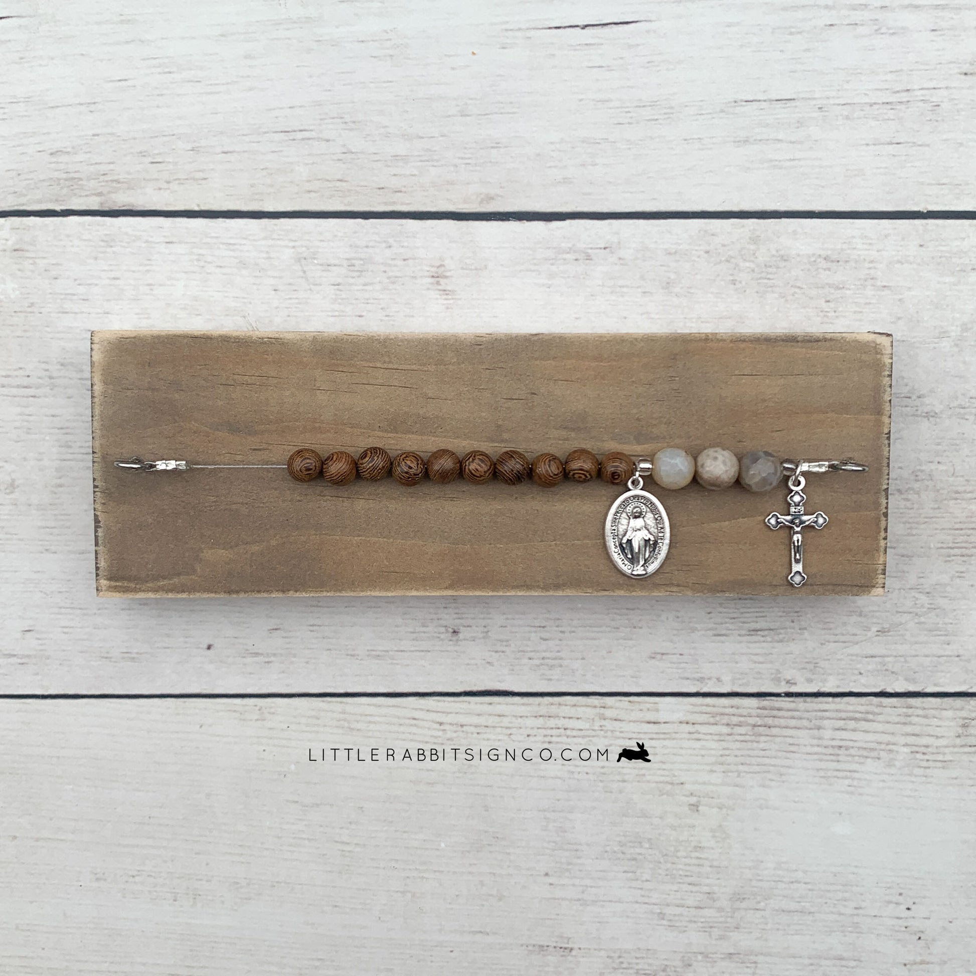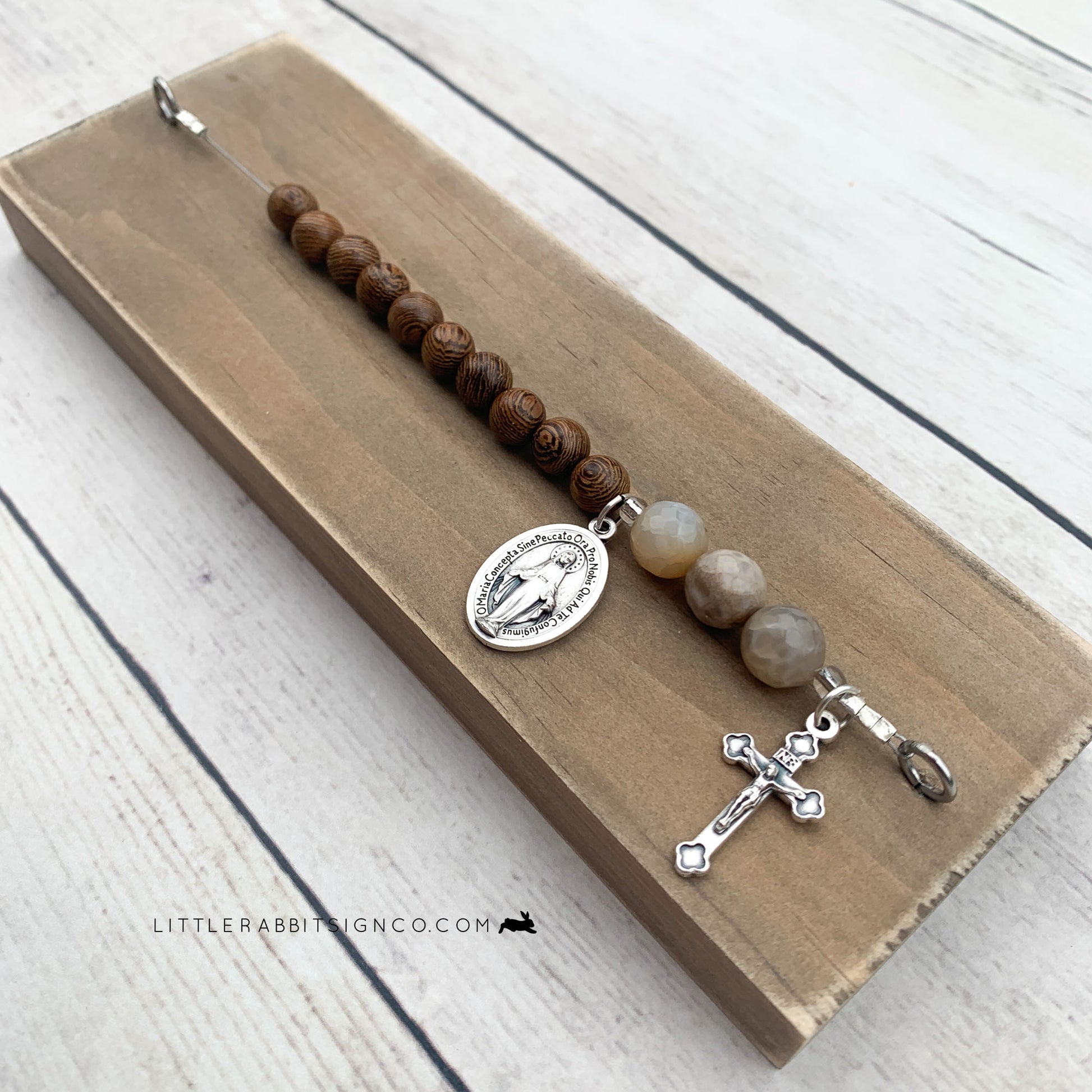DELUXE DESK CHAPLET in light brownish-gray background with dark wood and natural stone beading. Also includes a silver miraculous medal and silver Byzantine Crucifix.
