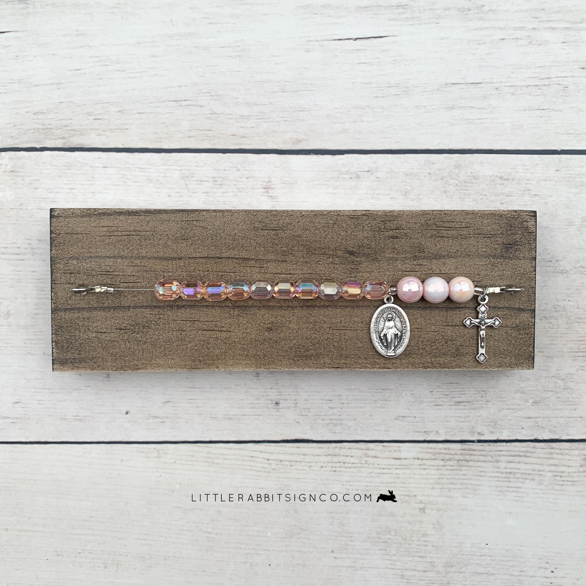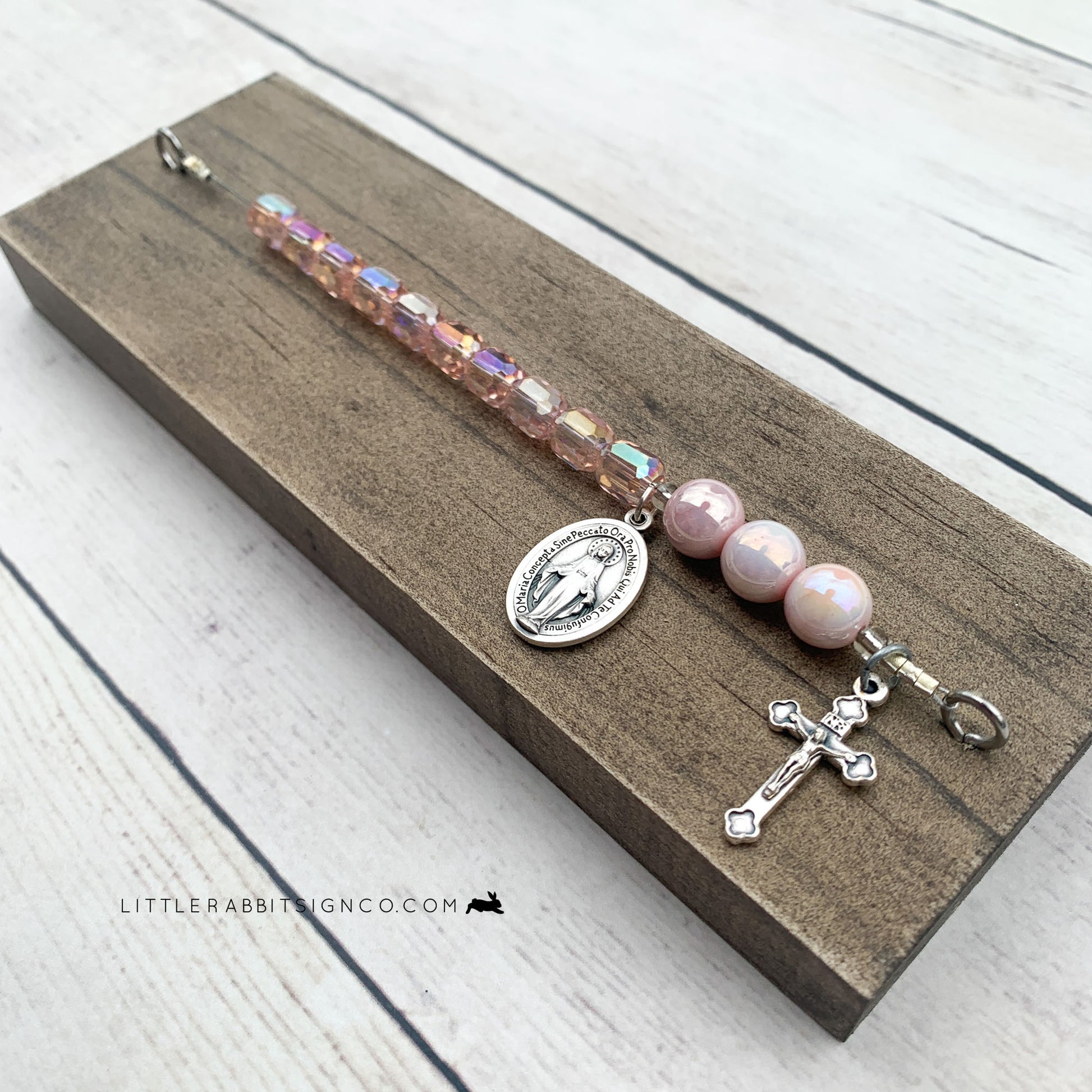 DELUXE DESK CHAPLET in gorgeous dark stained background with shimmery cylinder shaped pink crystals and opaque pink glass beading. Also includes a silver miraculous medal and silver Byzantine Crucifix.