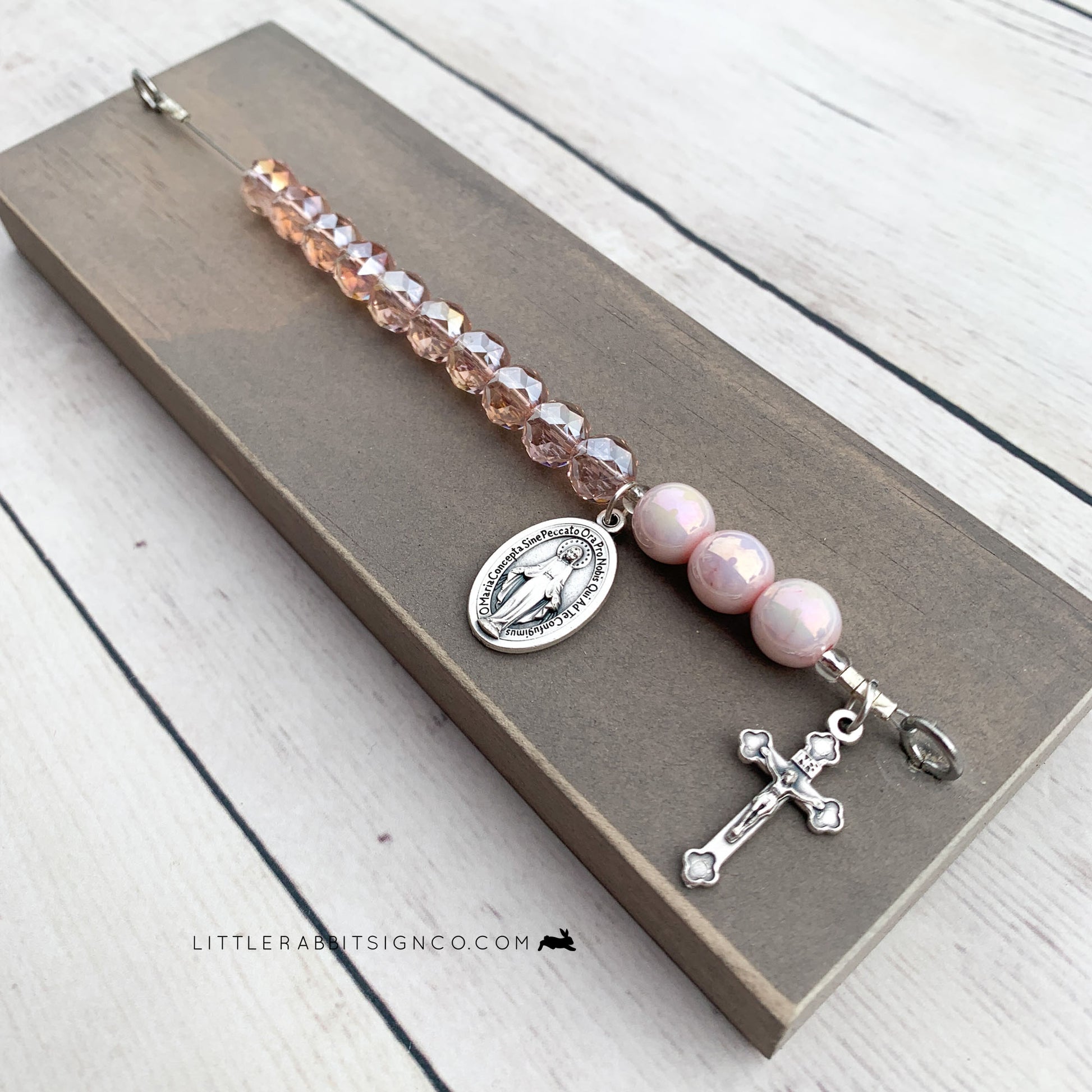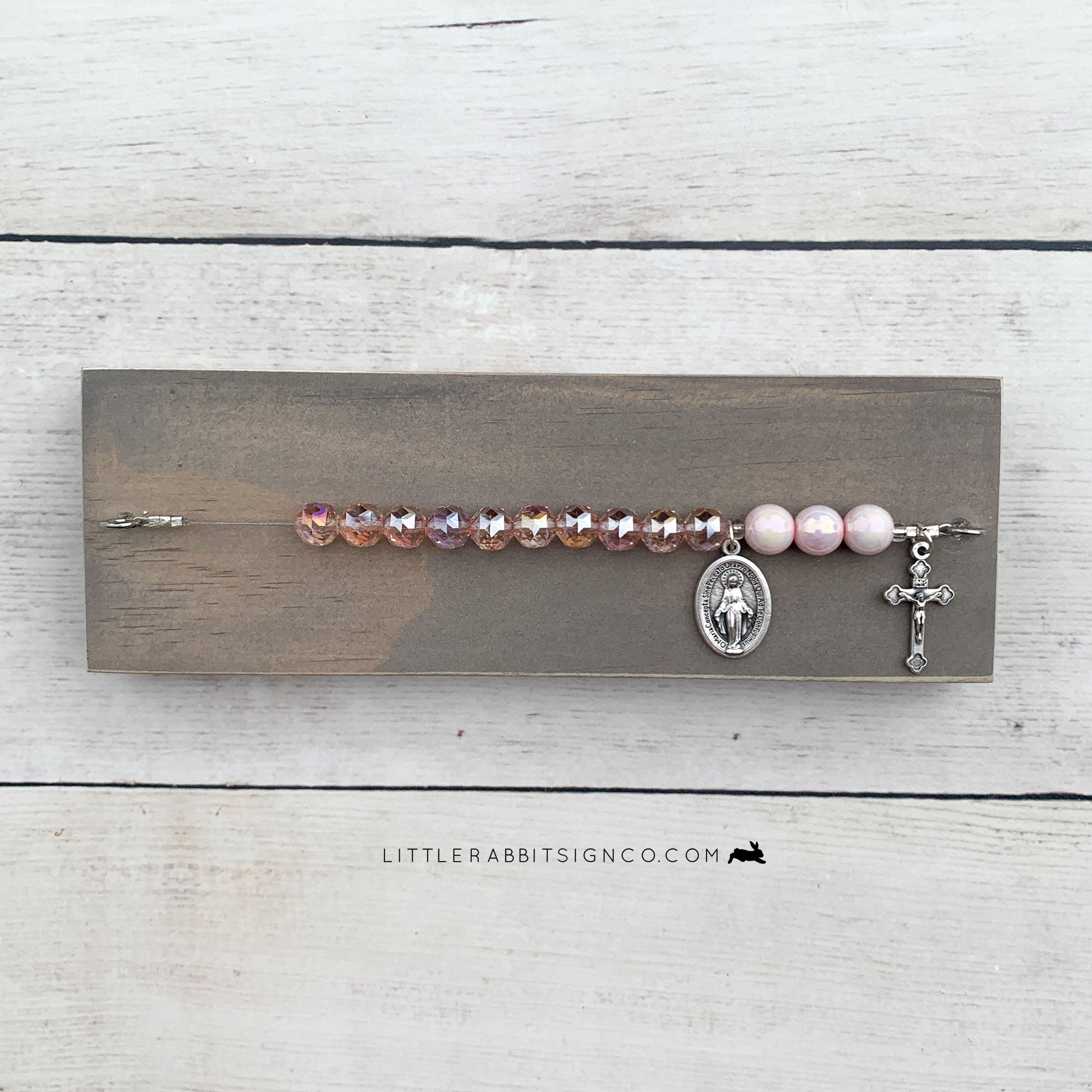 DELUXE DESK CHAPLET in gorgeous weathered gray background with pink clear, shimmer crystals and opaque pink glass pearl beading. Also includes a silver miraculous medal and silver Byzantine Crucifix.