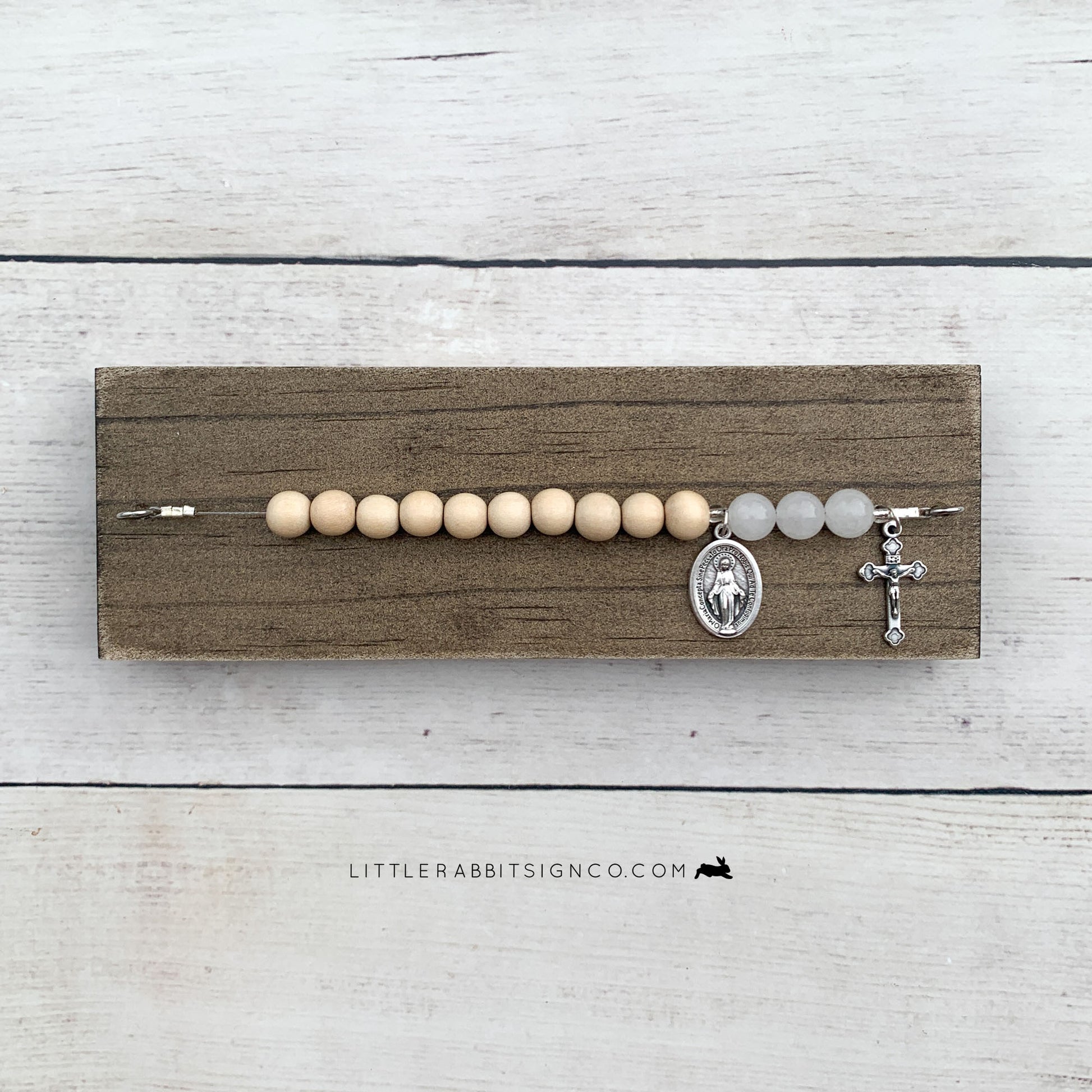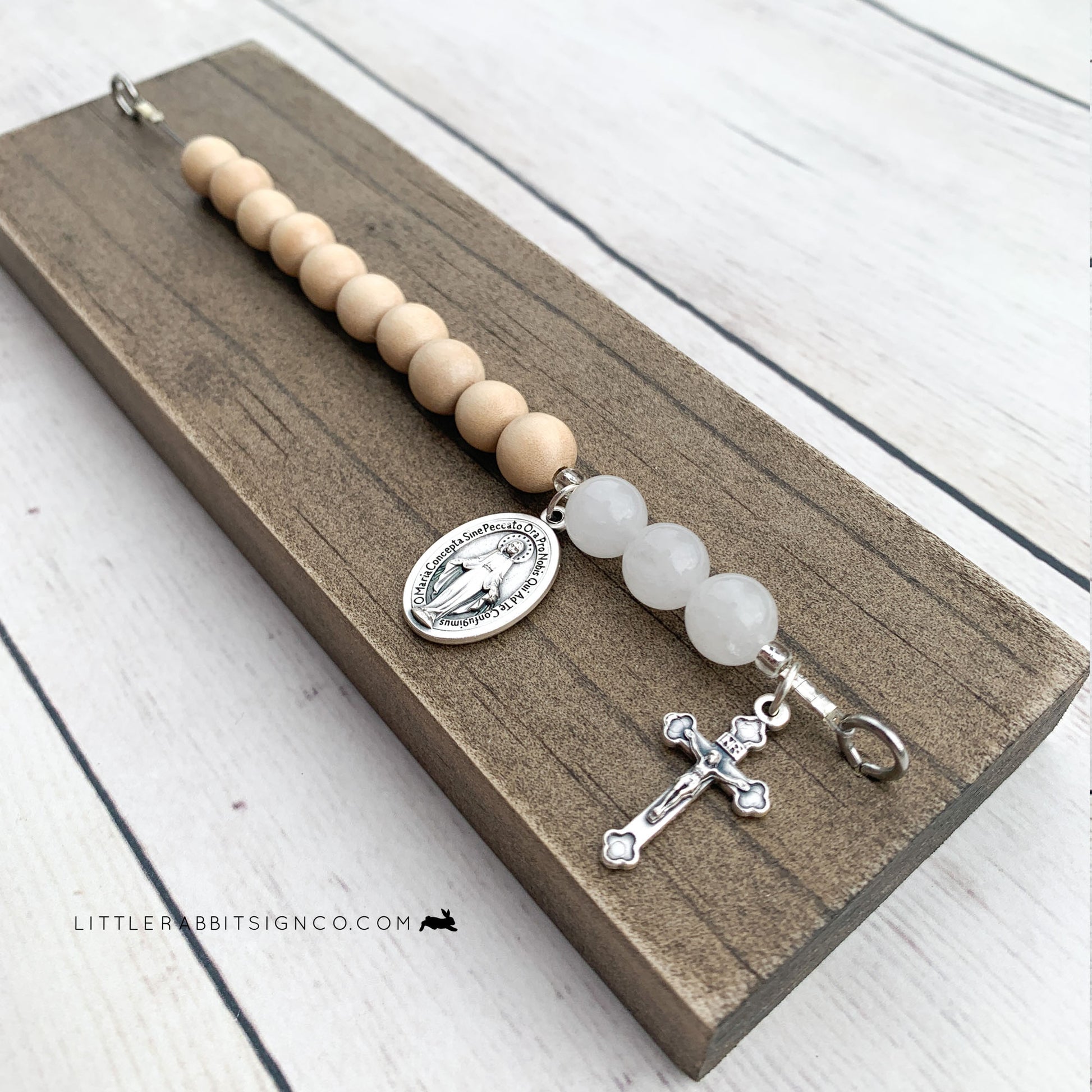 DELUXE DESK CHAPLET in gorgeous stained brown background with natural wooden and opaque white glass beading. Also includes a silver miraculous medal and silver Byzantine Crucifix.
