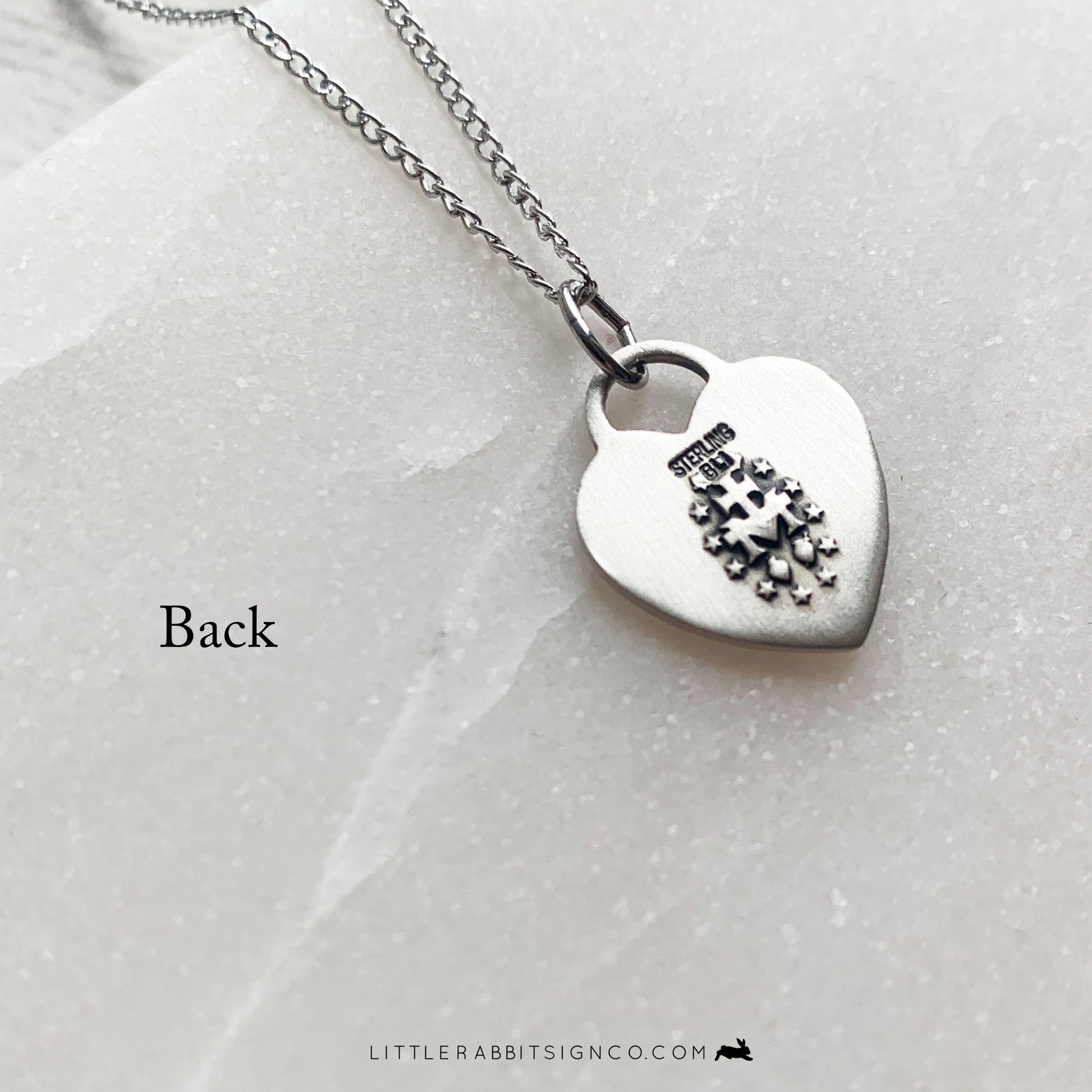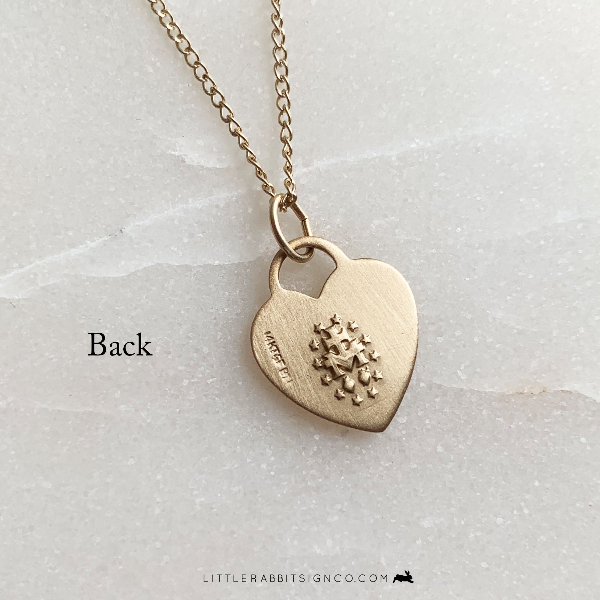 This gorgeous heart-shaped pendant features the traditional Miraculous Medal markings on the front and the back. Available in Sterling Silver or 14kt Gold Filled.