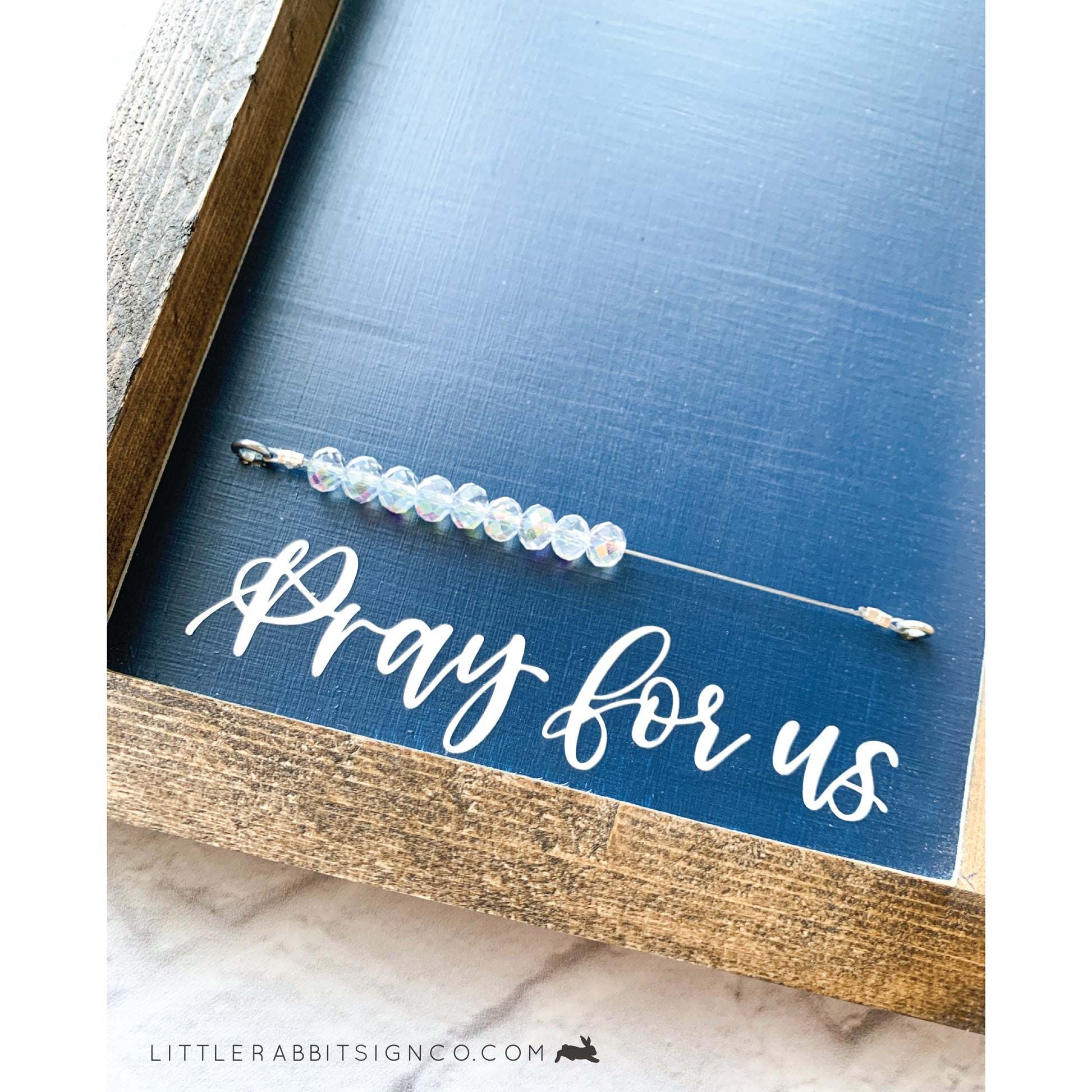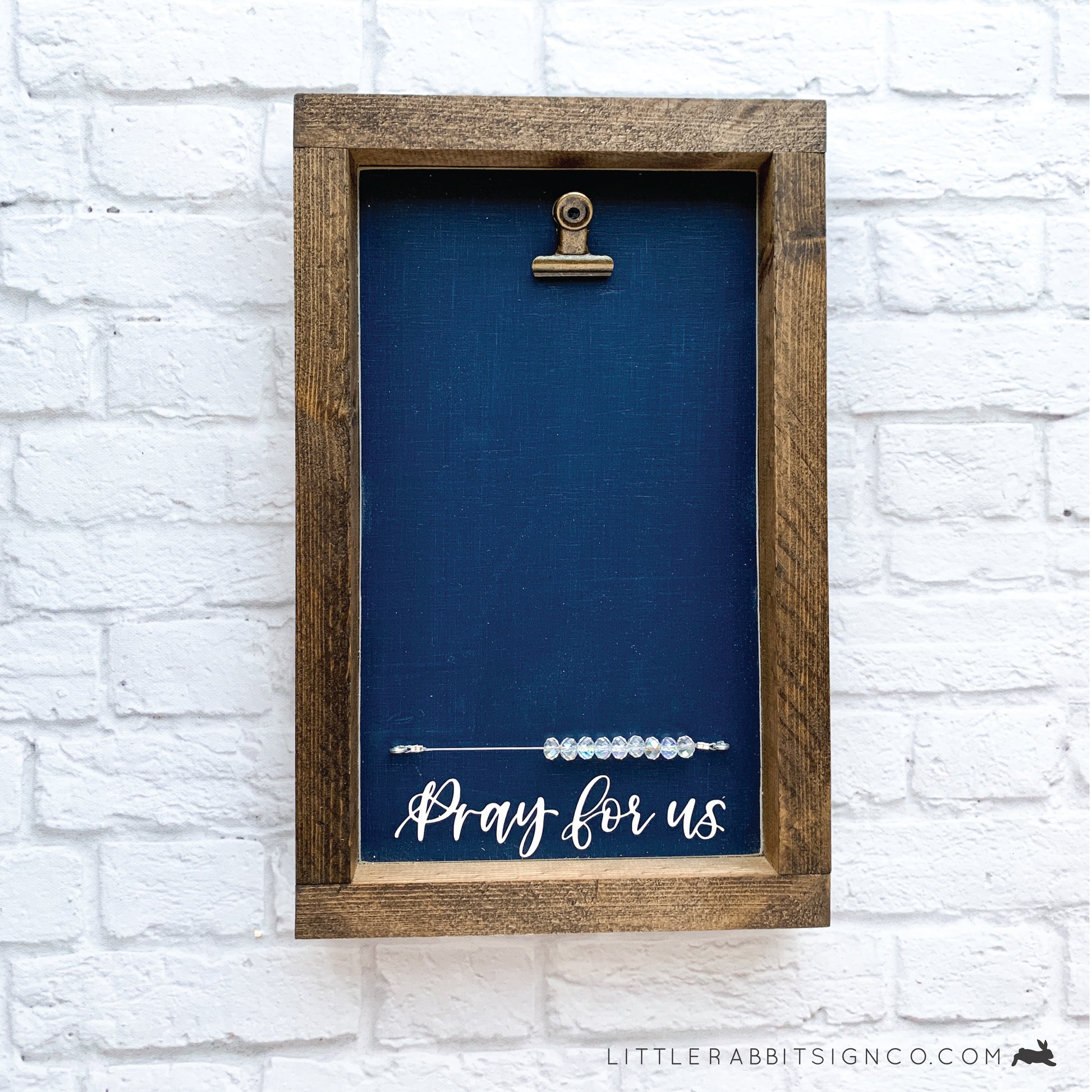 Novena Counter in Navy Blue with White lettering. This beautiful framed sign features nine iridescent crystal beads to keep track of which day you are on in your novena prayers. Slide one bead over each day, attach a prayer card, picture, intentions or an obituary card onto the bronze clip.