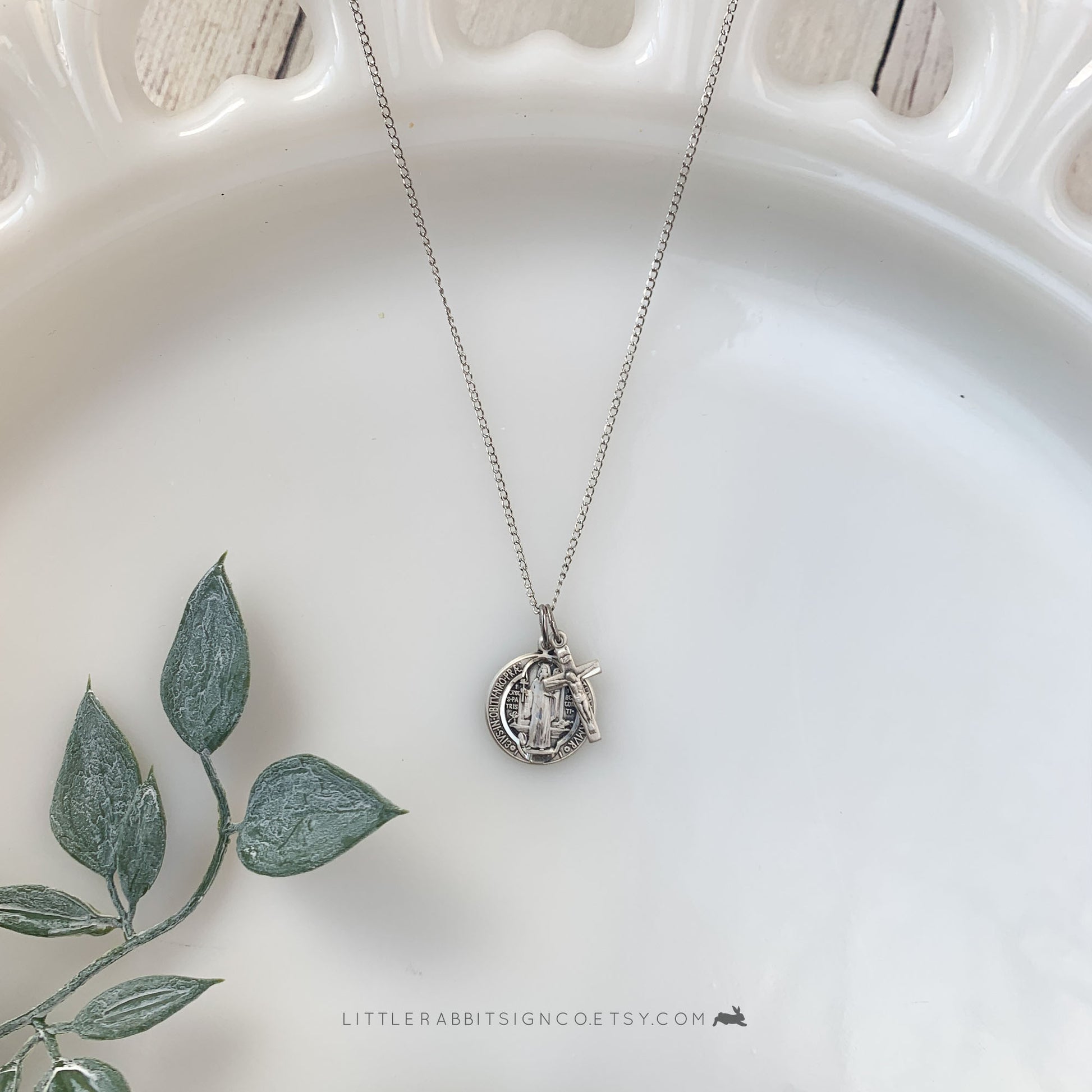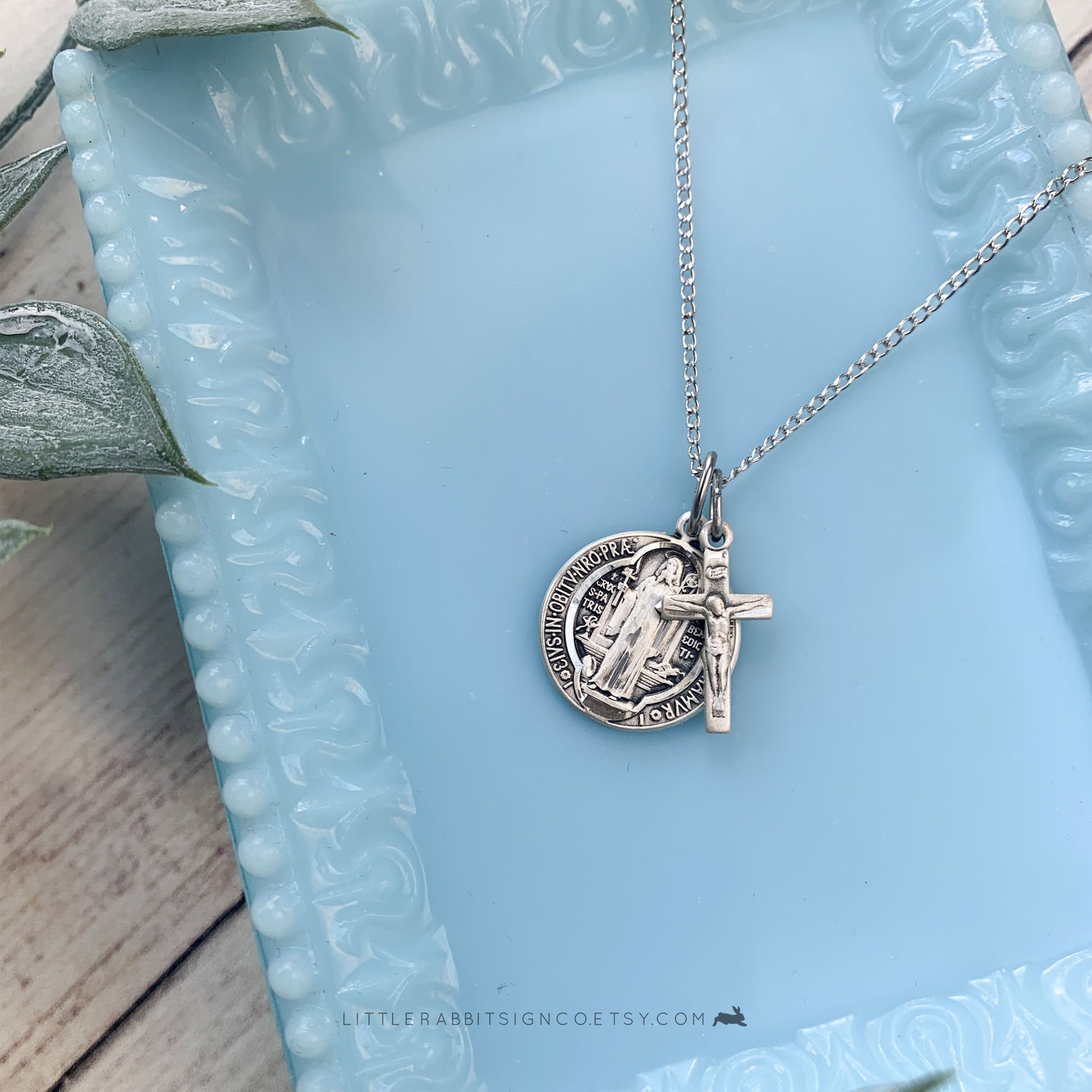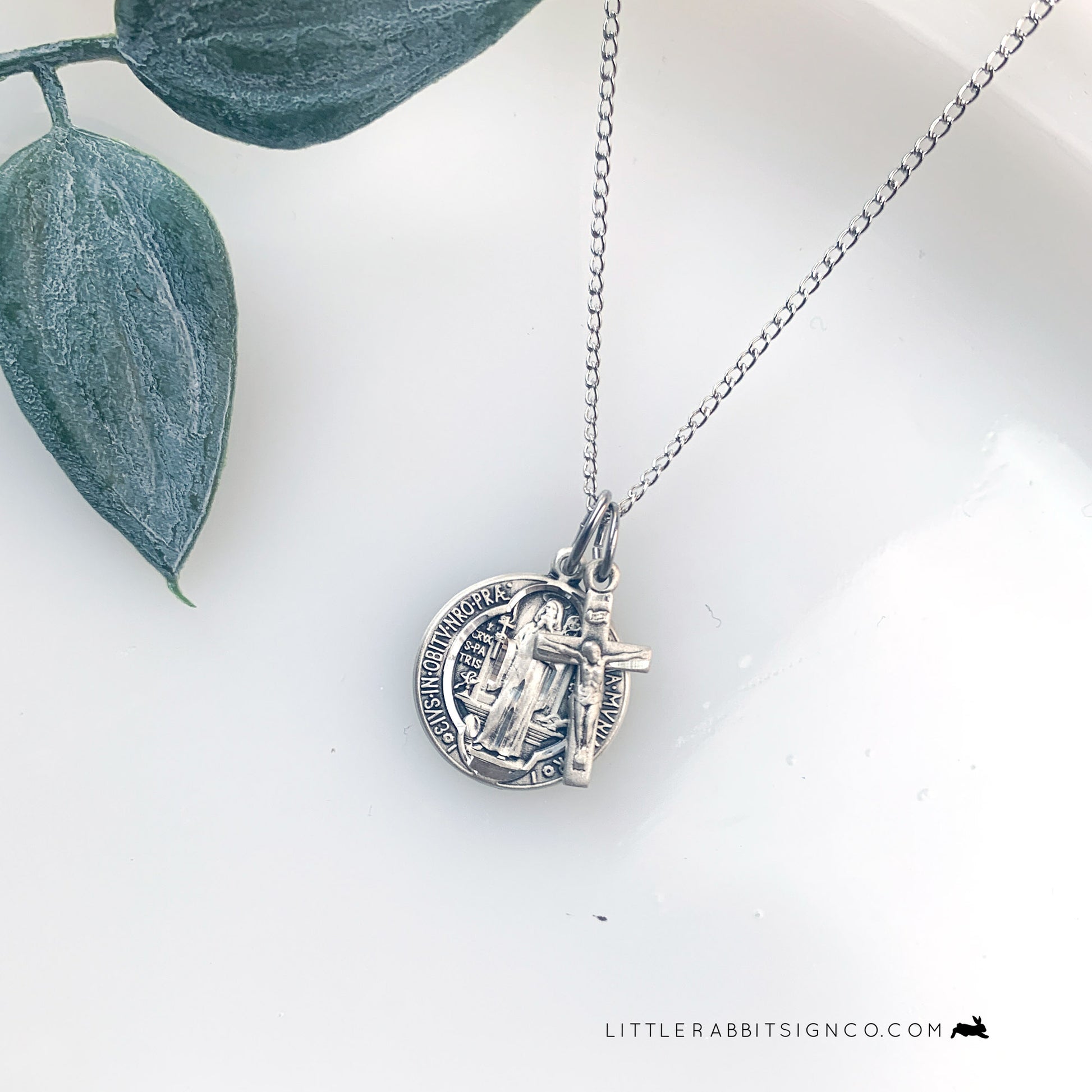 Petite Saint Benedict Medal layered on a sterling silver light curb chain with a gorgeous, petite Sterling Silver Crucifix. Closure is a lobster claw clasp. Available in a variety of chain lengths to fit your needs.