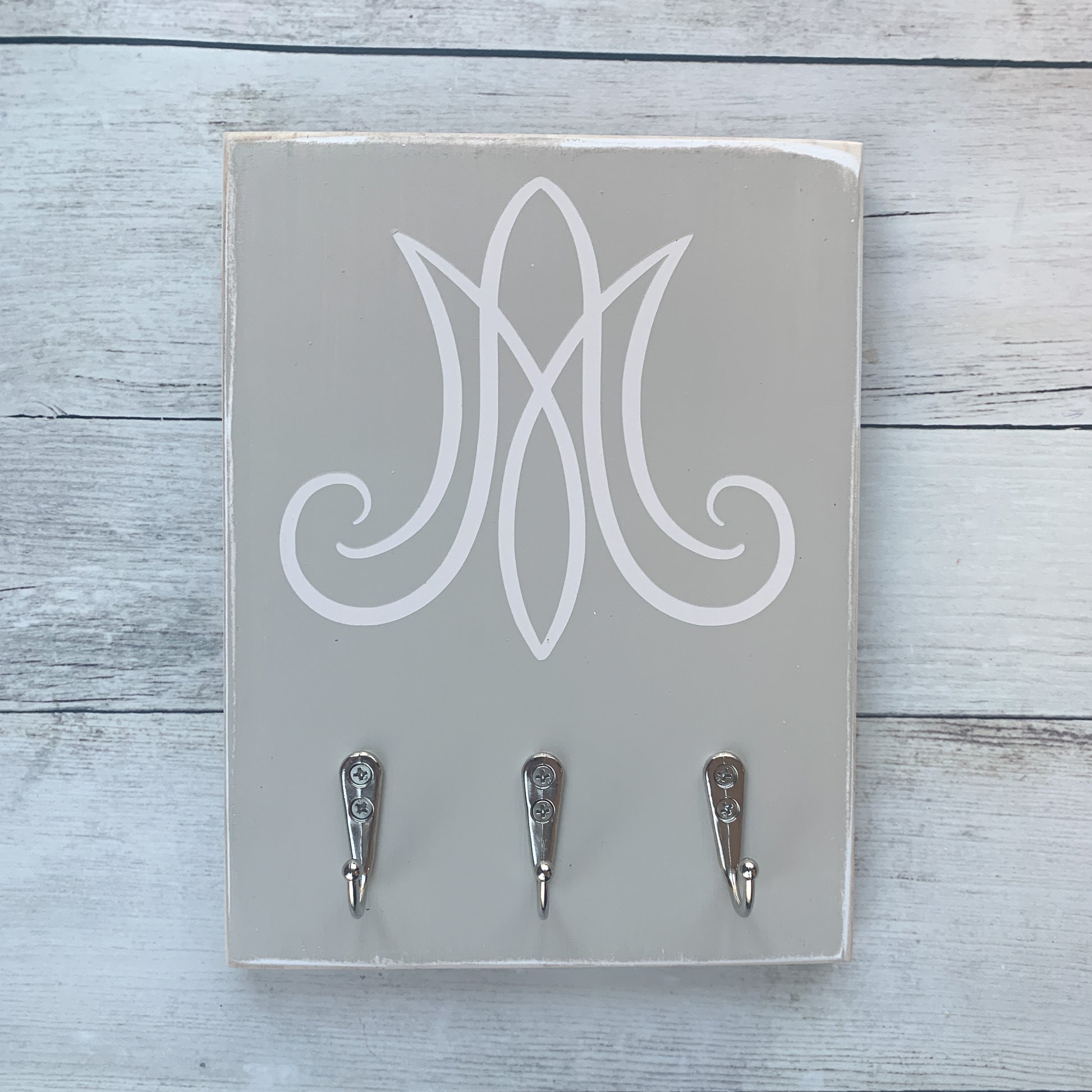 This rosary hanger features the beautiful line art of a rose bouquet along with three hooks to hang your rosaries. You could also use this hanger for your keys or dog leash! Two sawtooth hooks are attached to the back to ensure that your hanger remains level even if only one hook is in use.